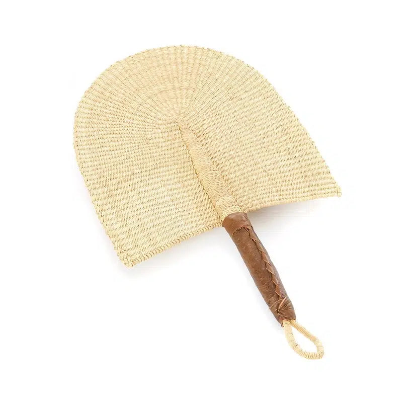 Talented weavers in Ghana's northern Bolgatanga region craft beautiful hand fans from veta vera grass, also called elephant grass. A soft leather handle adds comfort. The fan doubles as wall art when not in use.