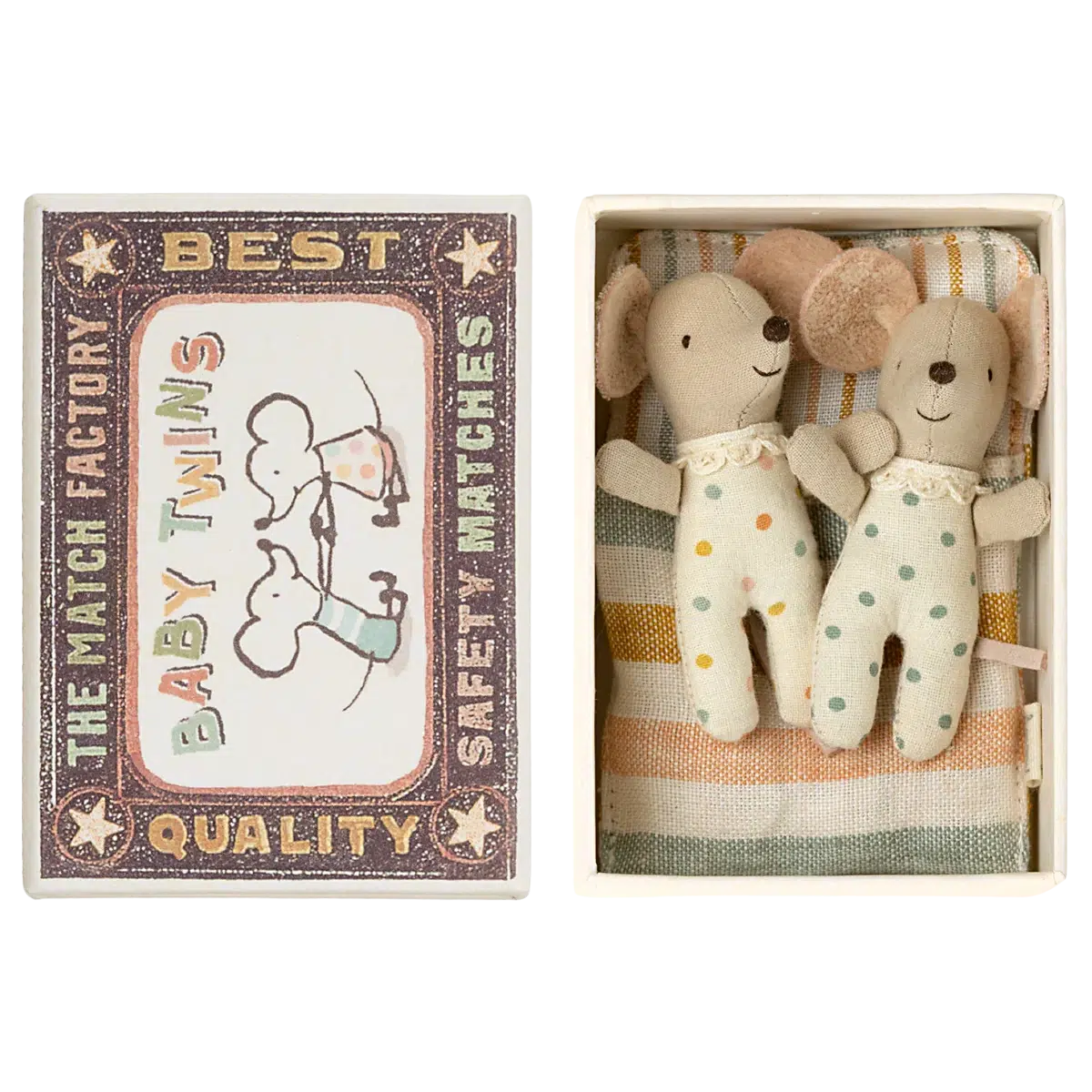 Meet our adorable baby twin mice, snugly tucked side by side in their cozy sleeping bag, nestled perfectly in their matchbox bed. These tiny twins, dressed in charming polka dot onesies, will keep their mum on her toes during the day and sleep soundly at night.