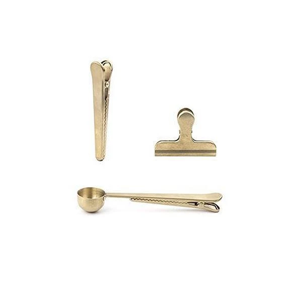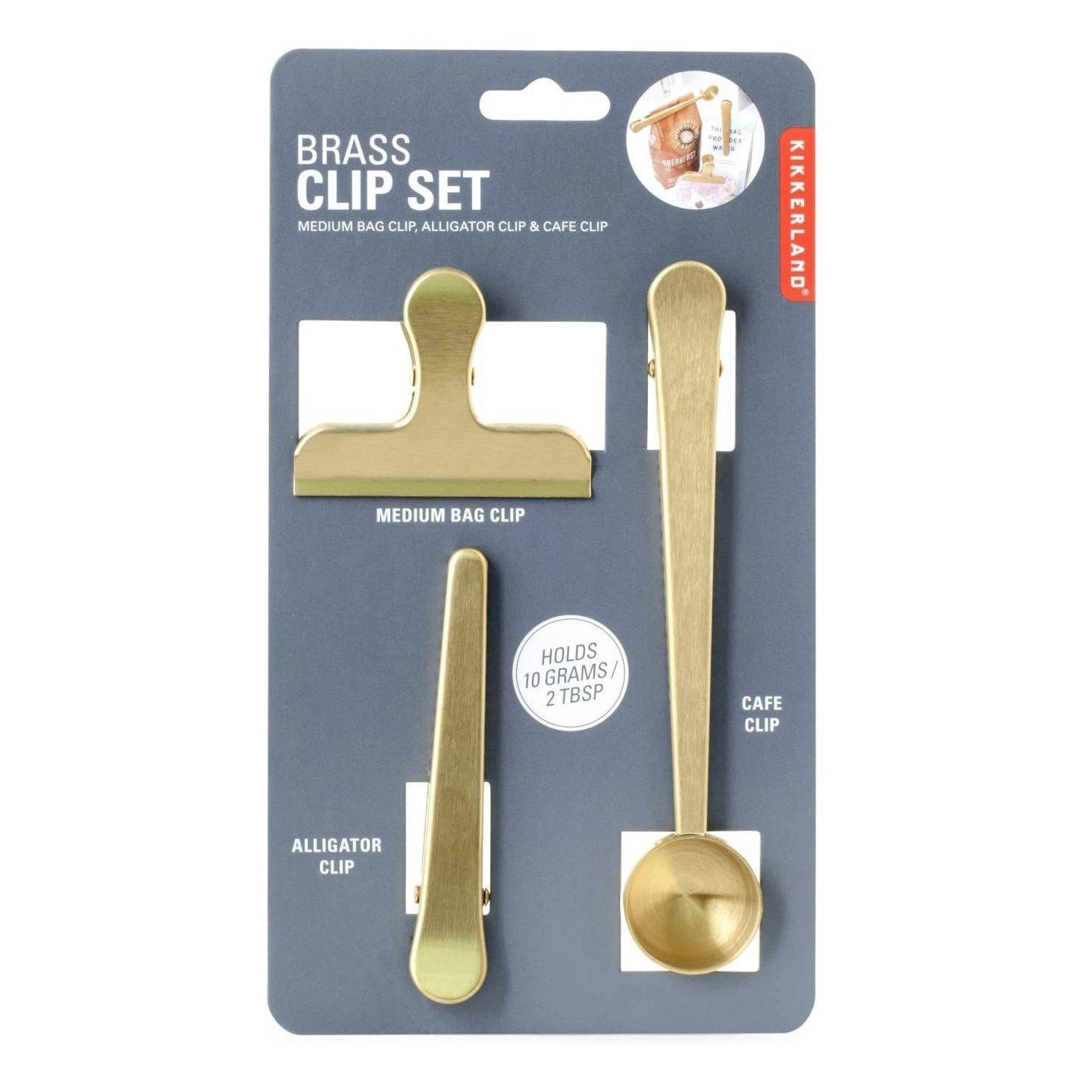 Reduce clutter, keep coffee and snacks fresh. Set of three smart brass clips from Kikkerland, includes an Alligator Clip, a Medium Bag Clip and Cafe Clip with Spoon, to seal your fresh coffee and to measure it with. Made by Kikkerland.