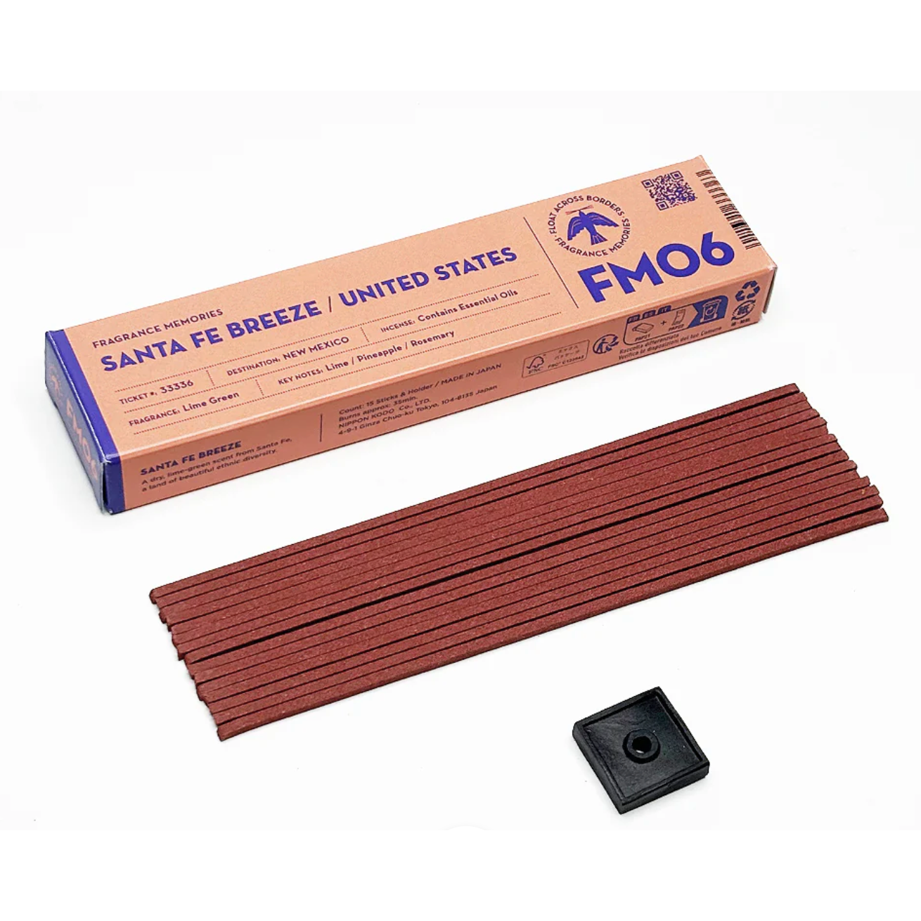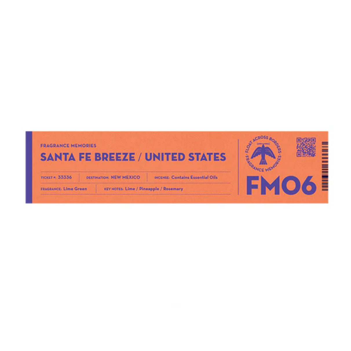 Fragrance Memories Santa Fe Breeze United States Incense. Go on a trip around the world as many times as you’d like from the comfort of your own room. The pleasant sensations, sights, and sounds of a journey come to you at a moment's notice through fragrance. Longing for the world's most spectacular sights yet to be seen, the elation and thrill of an extraordinary experience lies within each stick of incense. Santa Fe, one of the oldest cities in America, is where rich history and traditions blend together. The city delivers colorful, ethnic, and vibrant scenes with a refreshing and pleasant atmosphere. A scent of a dry, lime green fragrance.