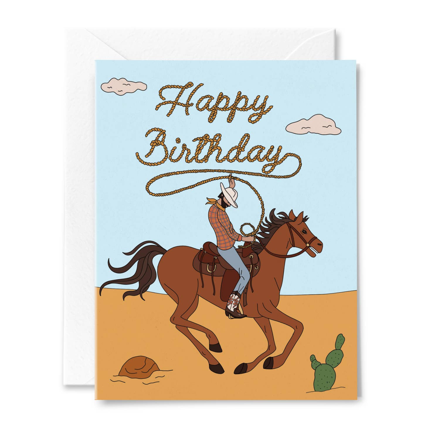 This card features illustration of a cowboy riding a horse lassoing rope that reads 'Happy Birthday' with a desert background including a cactuses.