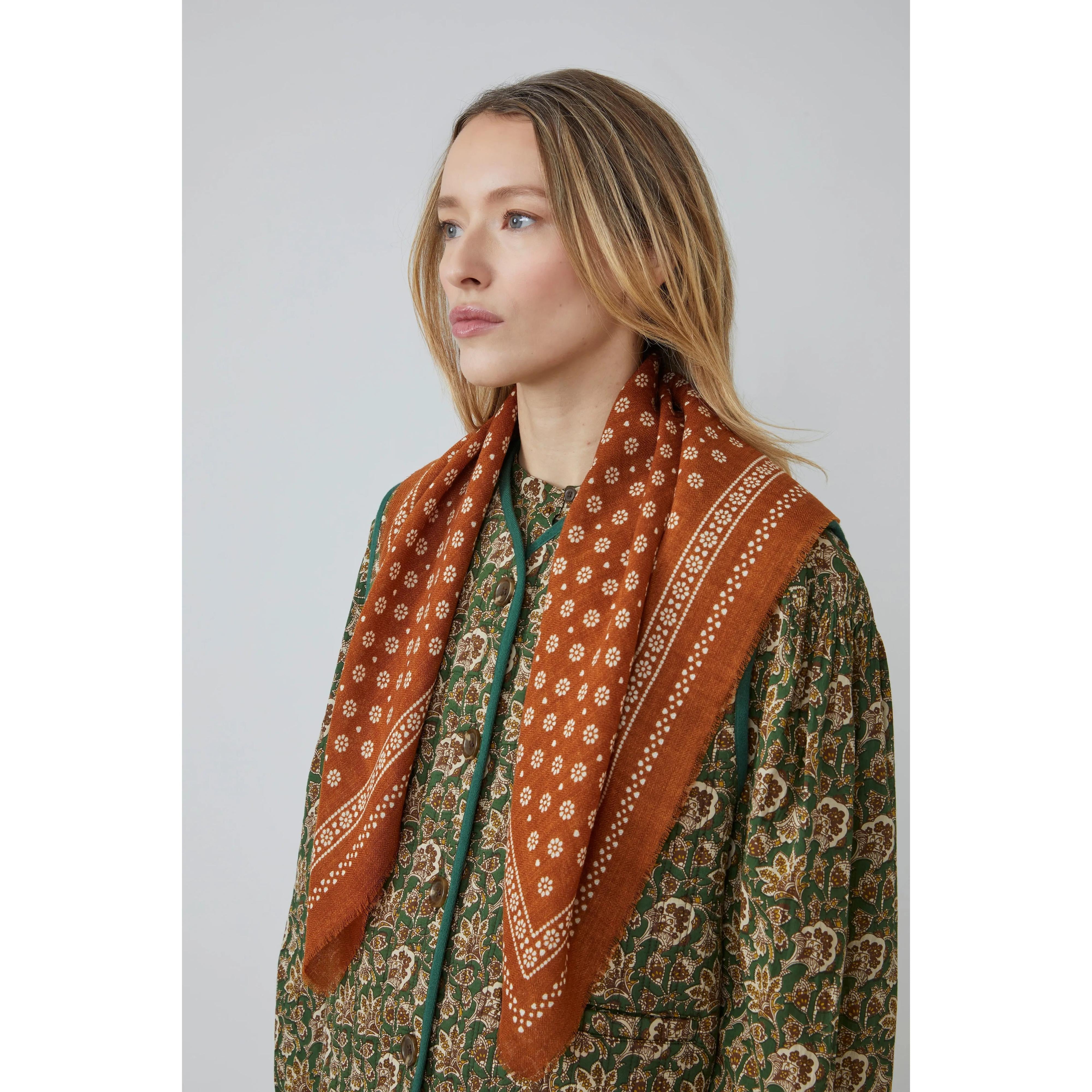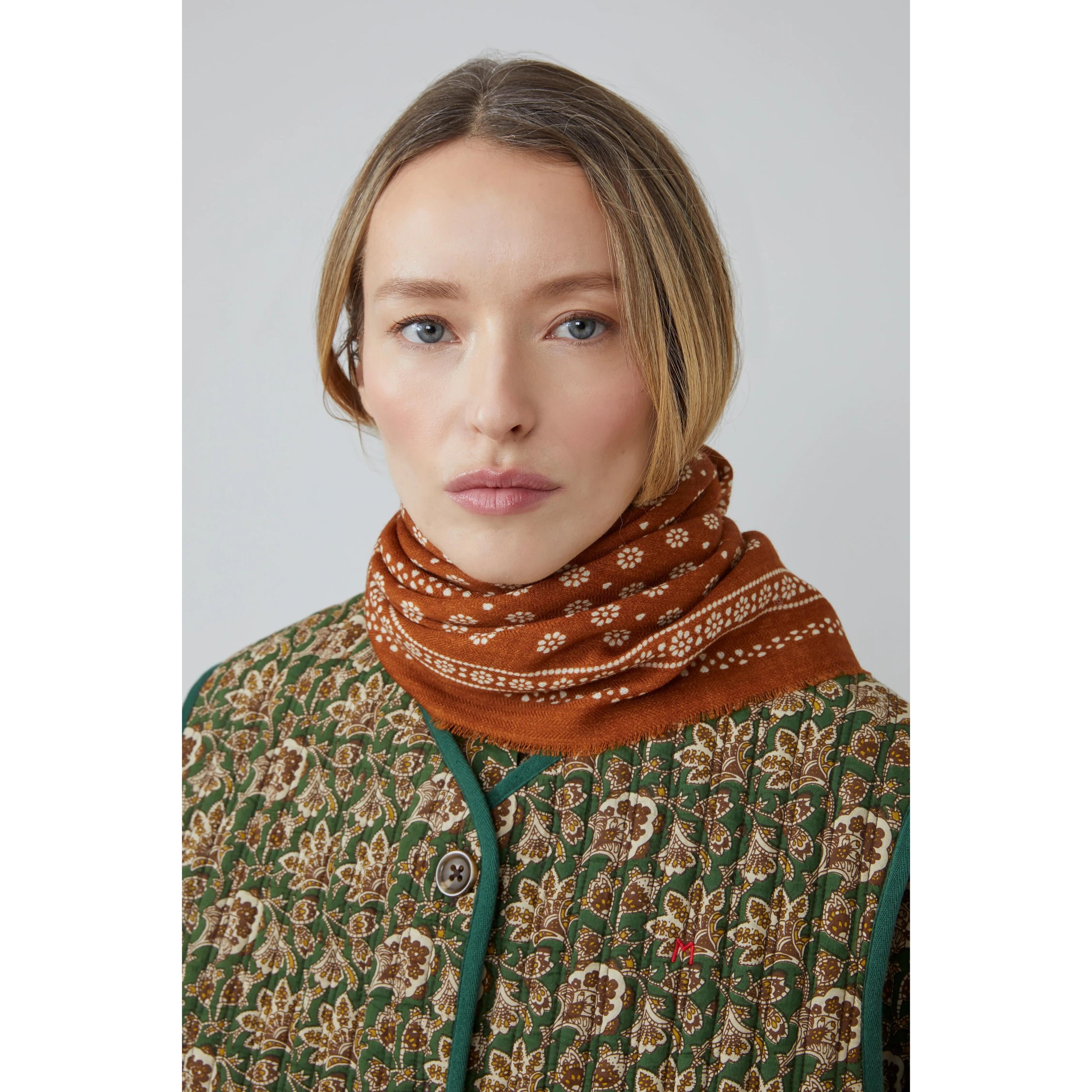 A subtle and elegant accessory from the Moismont wardrobe, the Olaf scarf N°676 is renewed each season in warm colors enhanced with small, delicate white flowers.