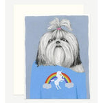 A hand drawn Shih Tzu in a unicorn t-shirt with a rainbow.