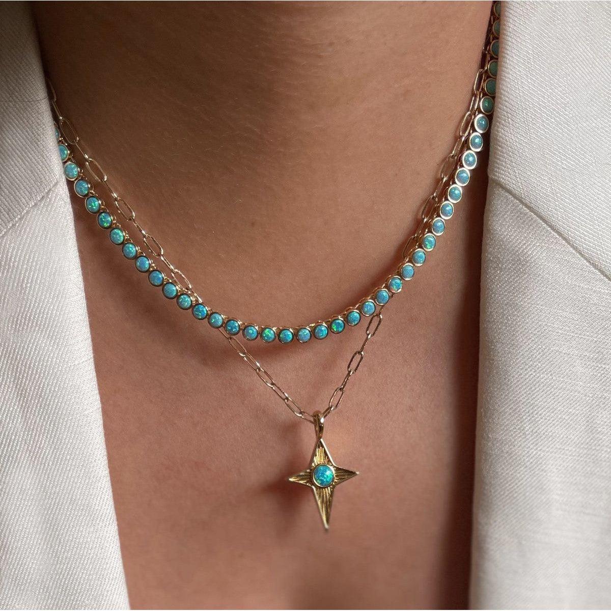 Serve up some style with our tennis necklace featuring hand-set opal cabochons in a stunning blue hue. Perfect for adding a touch of playfulness to any outfit, this 15.5 inch necklace is sure to make a statement. Game, set, match - your style game just got an upgrade!