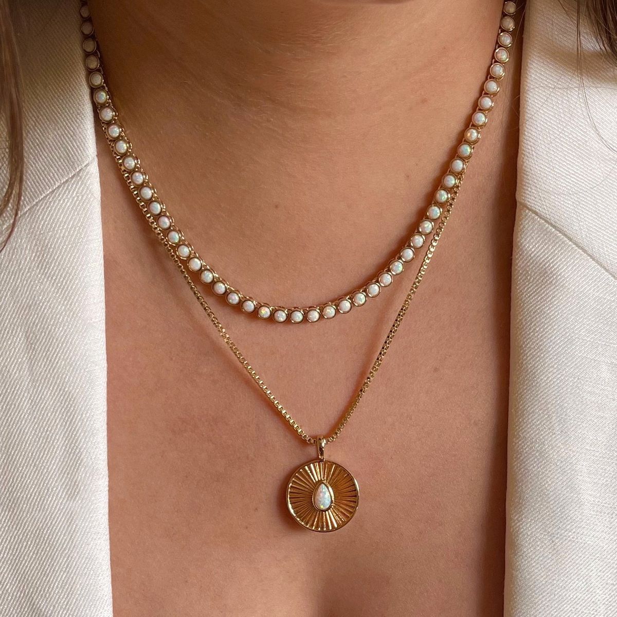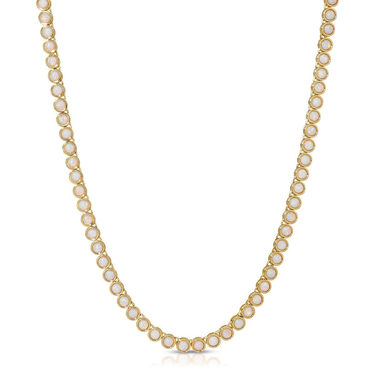 Serve up some style with our tennis necklace featuring hand-set opal cabochons in a stunning blue hue. Perfect for adding a touch of playfulness to any outfit, this 15.5 inch necklace is sure to make a statement. Game, set, match - your style game just got an upgrade!