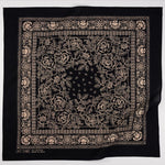 Soft organic cotton dyed a deep pitch black . Rosey-Danna's wild rose pattern inspired by Art Deco illustrator George Barbier, 18th century French textiles. A detailed border pays tribute to Indian woodblock printing. Yep! This one is a real trip.