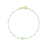 The Classic Gigi Eye bracelet by gigi CLOZEAU features signature 18 carat Yellow Gold, Turquoise resin pearls and a whimsical yet elegant design. Perfect for everyday wear!