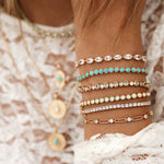 Serve up some serious style with our Tennis Bracelet featuring hand set blue opals. Perfect for adding iridescence to any outfit, this bracelet will be sure to make a statement on and off the court. Game, set, match!