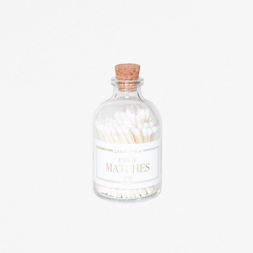 Colored tip matches in an apothecary-inspired glass bottle with a cork top and a striker on the bottom. Approximately 75 matches included.
