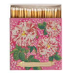 Our signature square matchbox featuring a bold pink background and the illustration of blooming pink petunias. The addition of gold foil details brings an added element of elegance to this design by Illustration of a woman in glasses holding a pen to her lips, with a butterfly, bird, and snail on her head, inside a pink circle. Florence Balducci