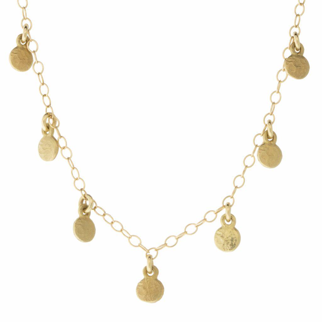This 14K 7 Tiny Disc Drop Necklace is an exquisite piece of jewelry. Handcrafted for durability, its bright 14K gold chain and 7 Tiny Disc Drop pendants are made to last, and designed to shine with a high polished finish. With a beautiful, hammered texture, this necklace is perfect for everyday wear or special occasions.
