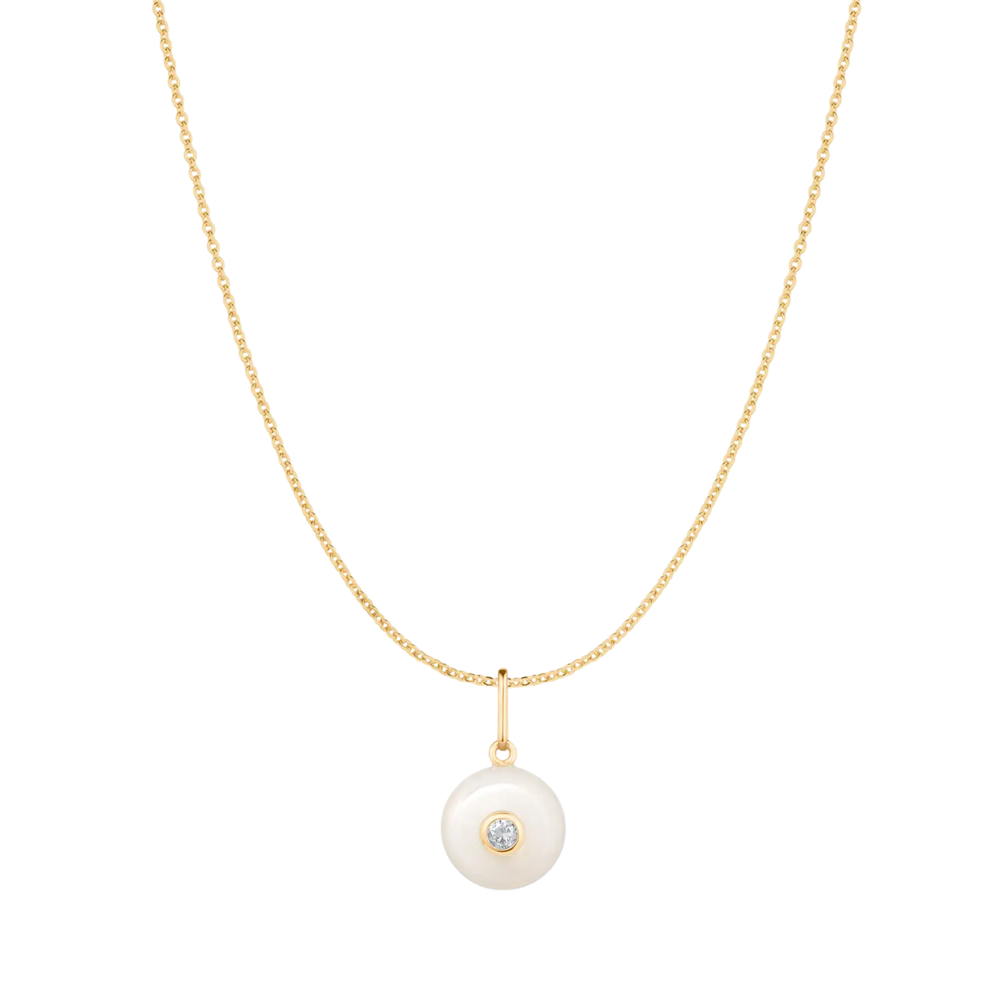 14k gold plated round mother of pearl stone charm with cubic zirconia on a Rae Cable Chain. 18"-20"