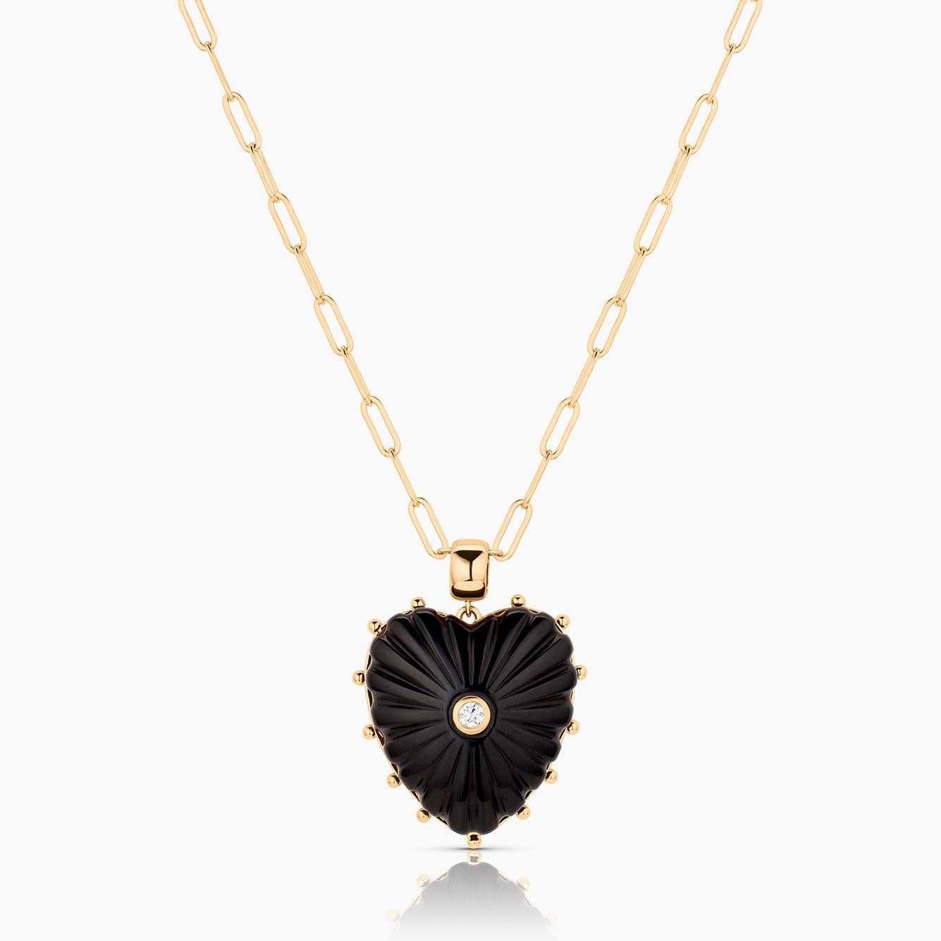 14k gold plated 3.4 mm Finn medium elongated chain with removable carved lapis and cubic zirconia heart pendant on a large round bail. Fully adjustable up to 18" in total length.