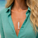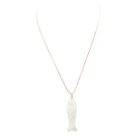 Gold plated chain necklace with a white labradorite fish pendant. The pendant, finely sculpted in the shape of a fish, is made of white labradorite. Its delicately textured surface captures the light and reveals subtle turquoise blue, almost pearly reflections.