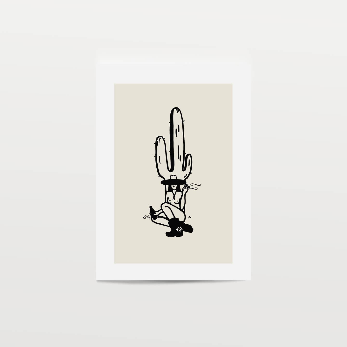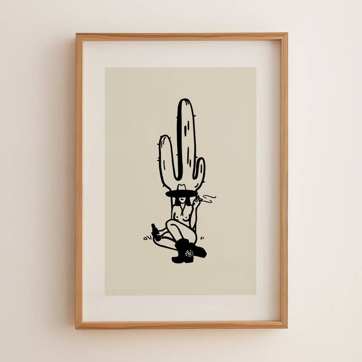 This art print showcases a vintage-inspired cowgirl finding peaceful solitude in a minimal desert landscape.
