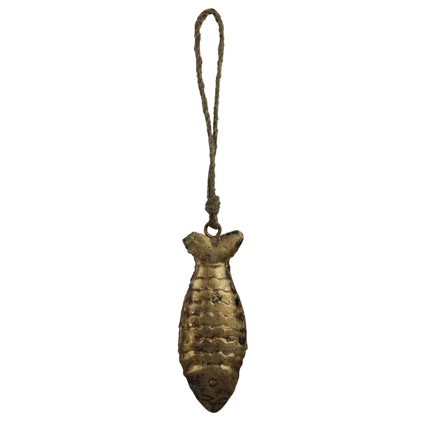 Forged of metal and plated with brass, this striking fish bell conveys a folk-like aesthetic with strong details and a beautiful ring.