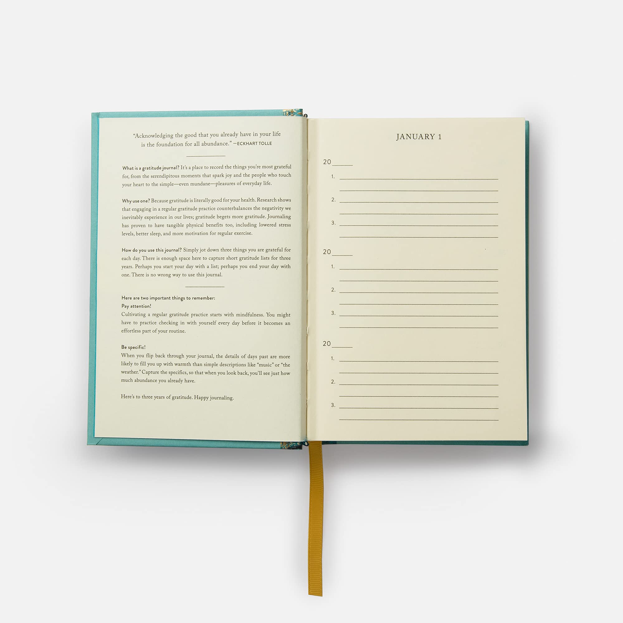 The Gratitude Journal is your in-road to happiness. Record three things you're grateful for each day and be mindful of how your appreciation for the world around you grows. With enough space to record a short gratitude list every day for three years, from the little things like a delicious cup of morning coffee to the way your family supports you in times of need, The Gratitude Journal is both a keepsake and a reminder of your life's gifts, day to day and year to year.