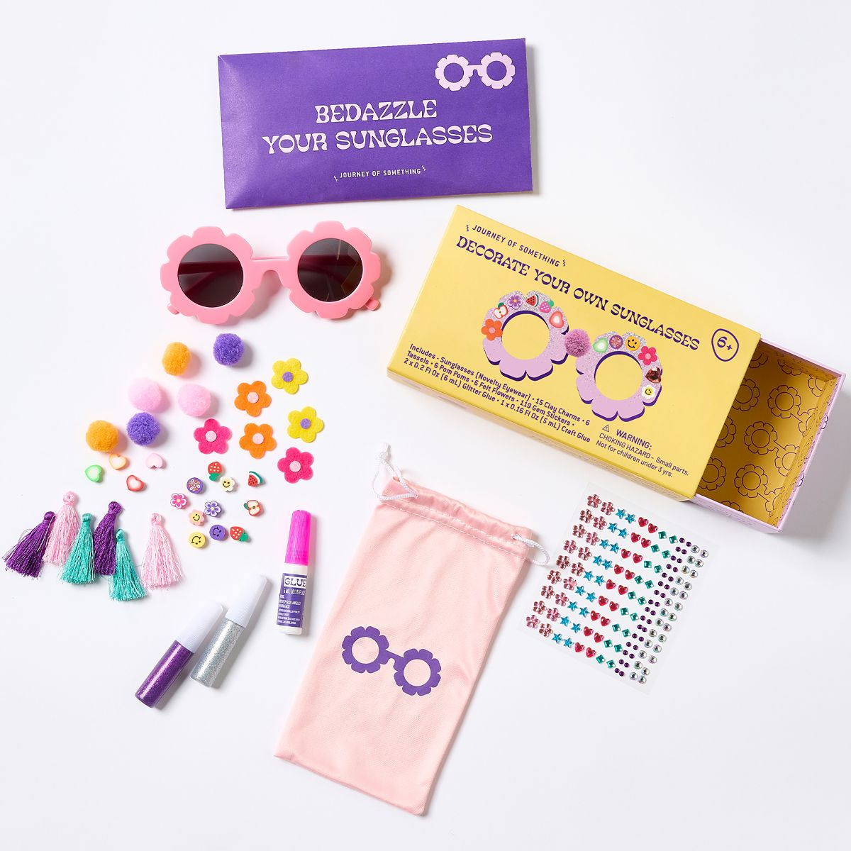 WHAT’S INCLUDED: 1 Flower-Shaped Sunglasses - A playful frame for decorating. 15 Clay Charms - Cute and colorful embellishments. 2 Glitter Glues - Add sparkle and shine. 1 PVA Glue - Easy application for decorations. 6 Pom Poms and 6 Tassels - Fun textures for extra flair. 50+ Gem Stickers - Bling it up with sparkly gems. 6 Felt Flowers - A floral touch for stylish designs. 1 Drawstring Glasses Bag - Store your masterpiece safely. WHY YOU’LL LOVE IT: Encourages Creativity and Self-Expression - A fun way for kids to personalize their accessories. Perfect for Ages 5 and Up - A creative DIY project designed for young crafters. Great for Parties and Playdates - A unique group activity that sparks imagination. Pairs with the Adult Kit for Family Crafting - A delightful mommy-and-me experience. NOTE: Stylish accessory only - not designed for sun protection.