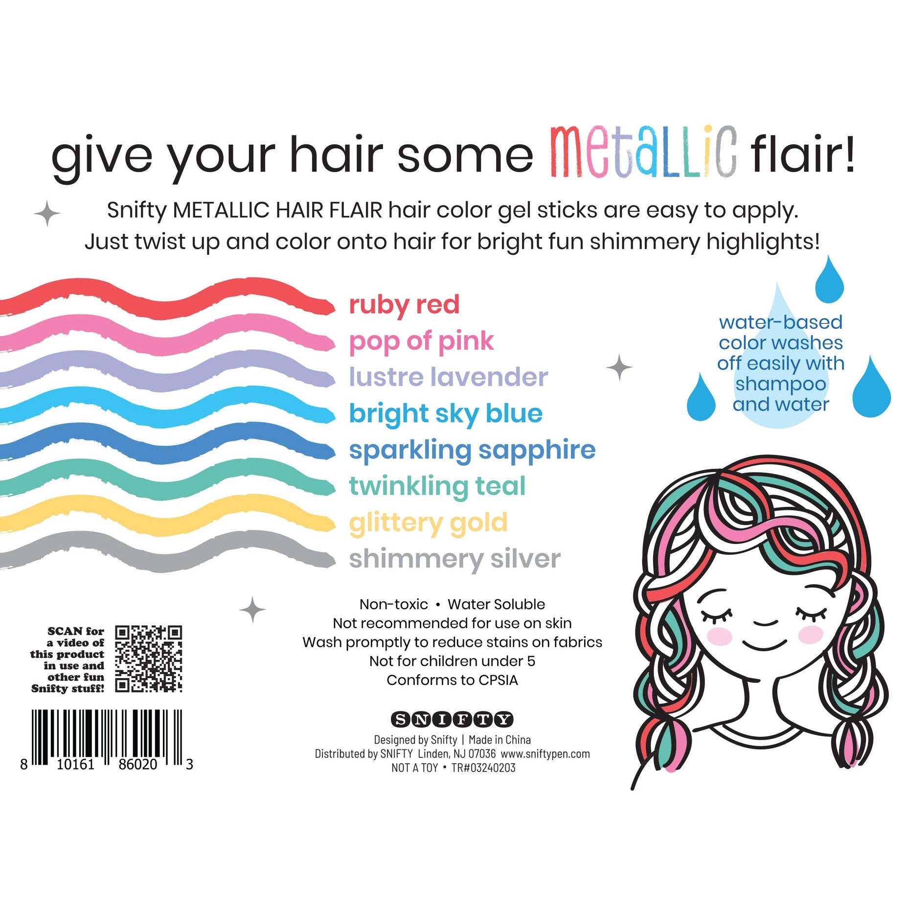 Add some metallic flair to your hair! HAIR FLAIR color-on hair gel sticks are like crayons for your hair… they make it as easy to change your hair color as it is to change your mood!
