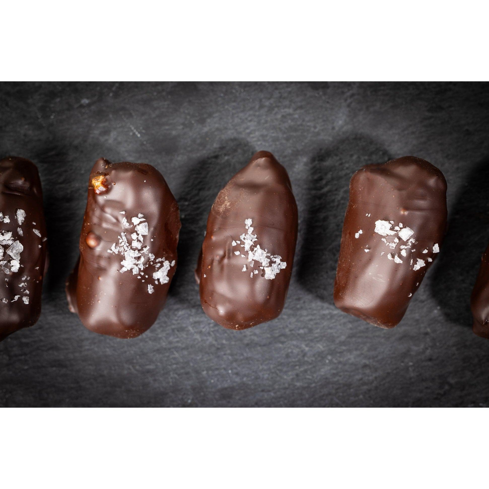 **medjool dates are filled w/ creamy lime cashew nut butter and crunchy toasted quinoa then covered in 85% dark chocolate.