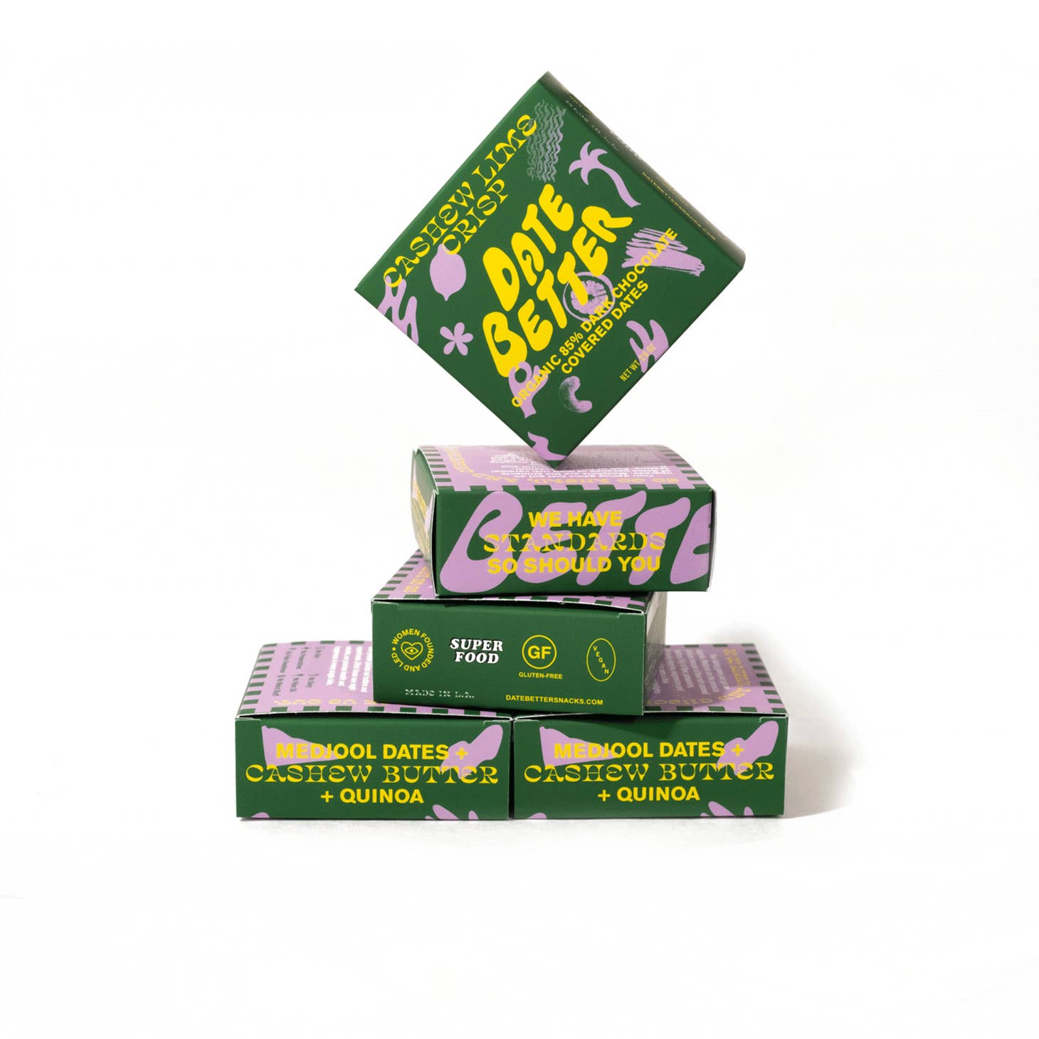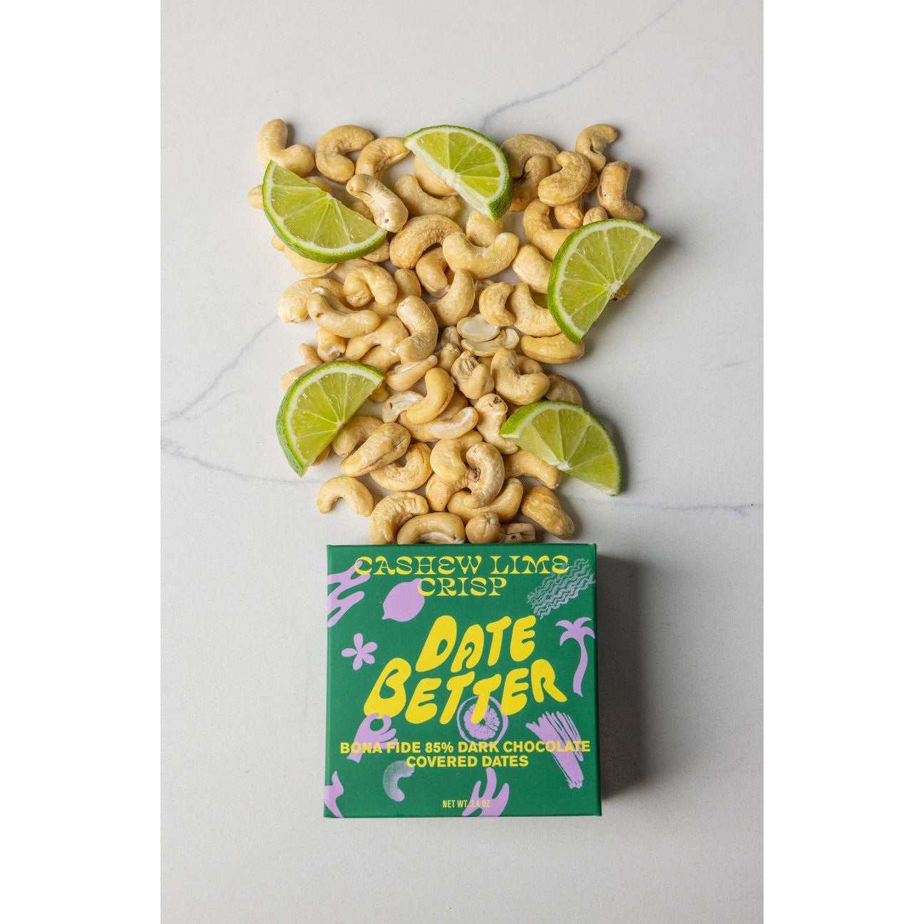 Medjool dates stuffed with creamy cashew butter combined with toasted quinoa is familiar yet surprising. Coated in 85% organic dark chocolate and infused with lime; the sour spark hits the tongue and fades like the summer romances of then and now.
