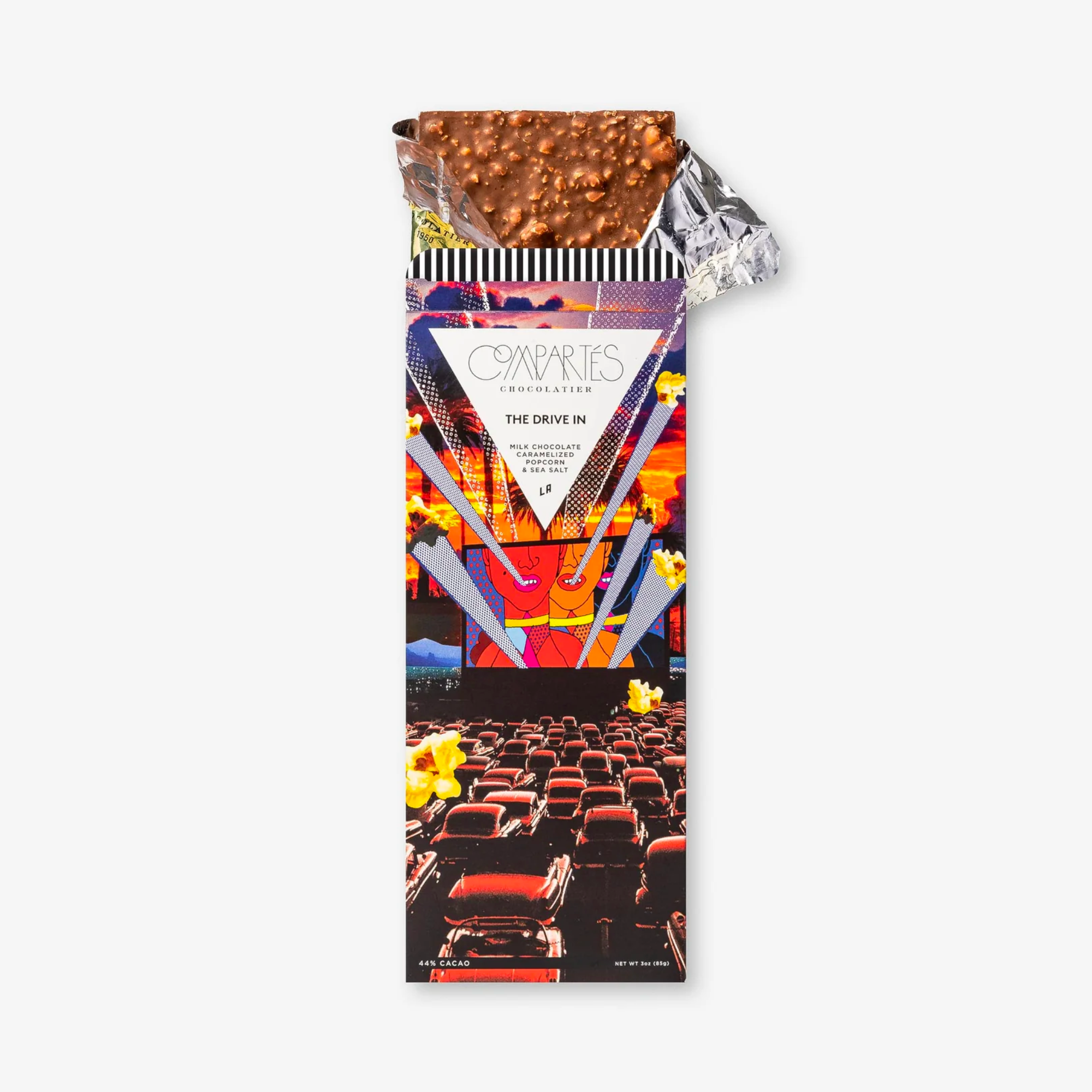 Compartés gourmet milk chocolate and popcorn Drive In bar takes you to the movie theatre with just one bite. Made with our traditional candy corn, kettle corn and caramelized movie popcorn all crunched up and drenched in our signature milk chocolate. If you go to the movie theatre and mix your chocolate with your popcorn, this chocolate bar is for you! Features a drive-in movie theatre mixed with Los Angeles Hollywood iconic on the packaging. Handmade in our Los Angeles chocolate kitchens.