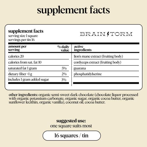 A mouthwatering chocolate bite for a clean boost of energy, focus and clarity without the crash. Each bite of Brainstorm is formulated to boost long-term cognitive function while also delivering an immediate lift to energy, focus + mood. The long term benefits come from our functional mushrooms. Lion’s Mane and Cordyceps are felt over time — not instantly. When incorporated into a daily routine, the mushrooms’ nutrients compound in your body and become more effective (and noticeable) with sustained use. But we also know that nothing beats instant gratification. That’s why we’ve added Guarana and Phosphaditylserine to our formula. Guarana is a caffeinated Brazilian berry that provides a smooth flow of energy, and Phosphaditylserine is a fatty acid that improves alertness, reaction time, thinking speed, and focus throughout the day. Each square contains 66mg of natural caffeine. The result: an indulgent daily routine that’s good for you and only gets better with time