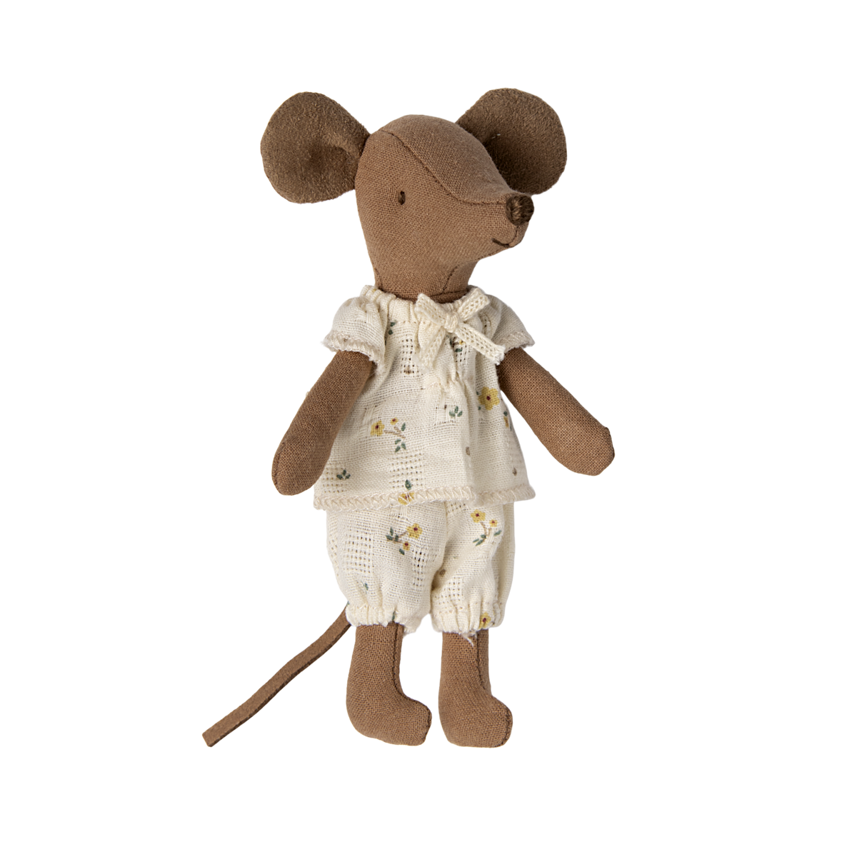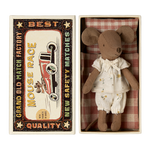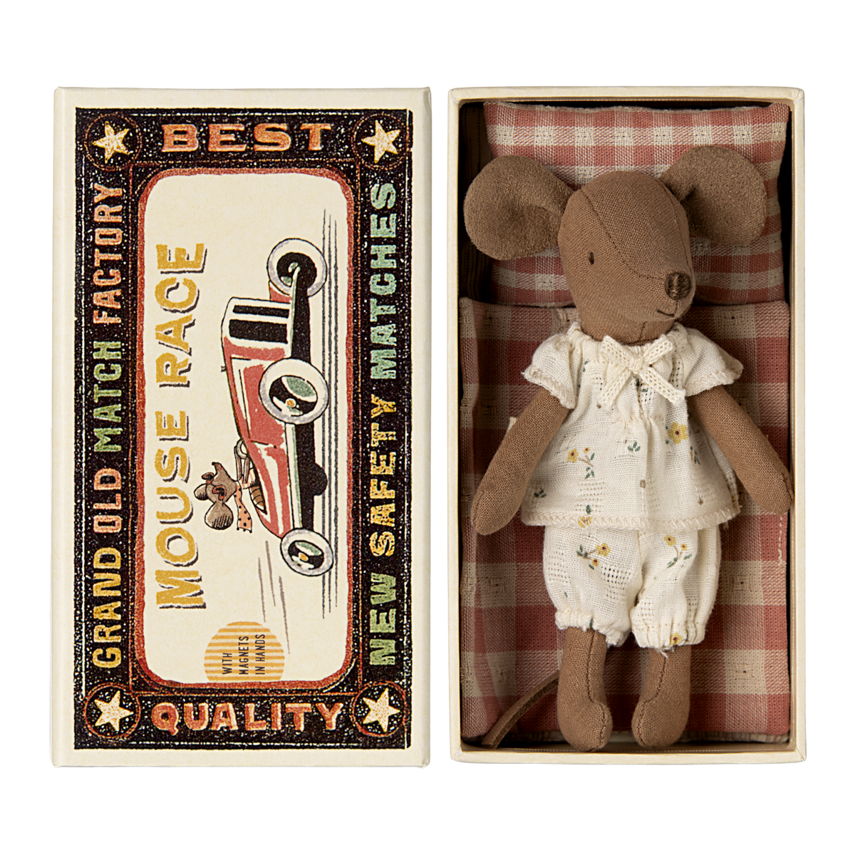 A classic Maileg item. This mouse is ready for hours of play and sleeps tight in the little matchbox. The clothes and bedlinen are made of soft fabrics with unique prints in beautiful colors. Extend the story by adding accessories to the play