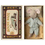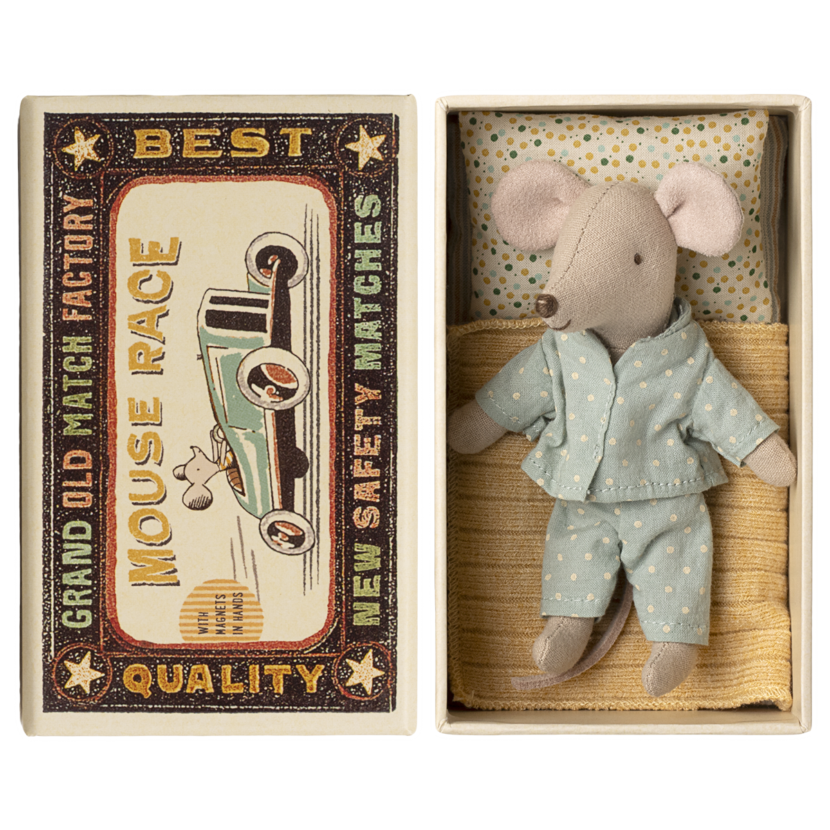 A classic Maileg item, this mouse is ready for hours of play and sleeps soundly in its little matchbox. The clothes and bedding are made of soft fabrics with unique prints in beautiful colors. The mouse has magnets in its hands.