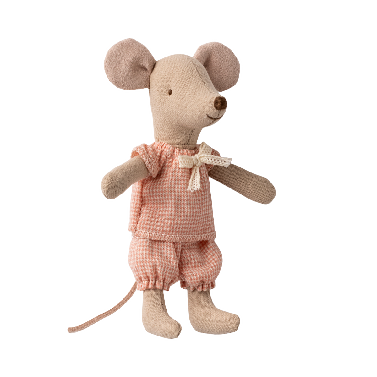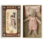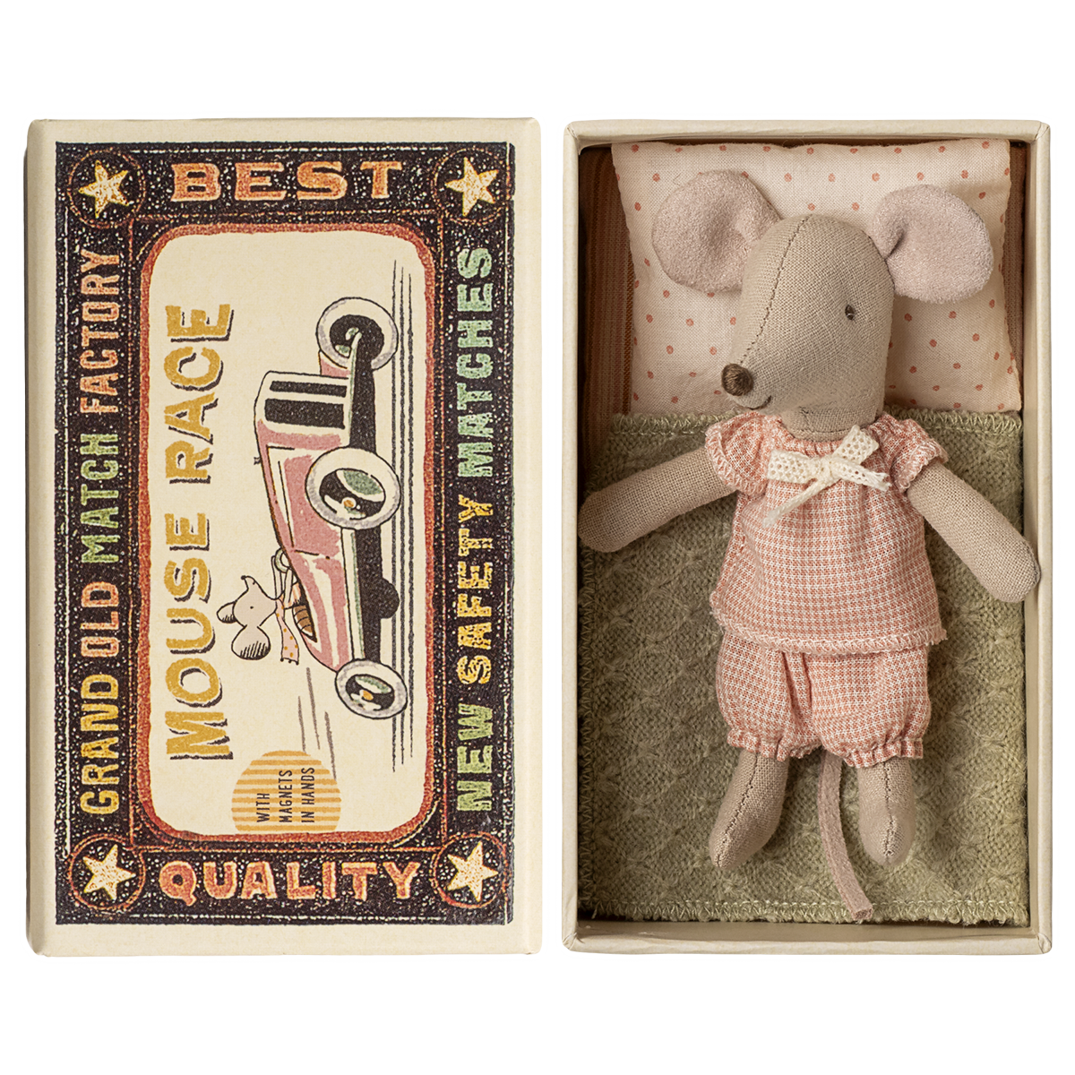 A classic Maileg item, this mouse is ready for hours of play and sleeps soundly in its little matchbox. The clothes and bedding are made of soft fabrics with unique prints in beautiful colors. The mouse has magnets in its hands.