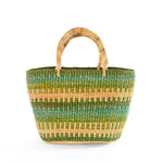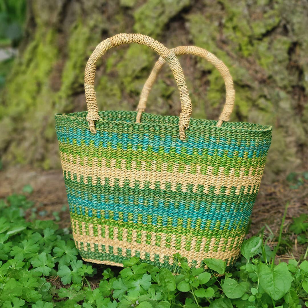 Artisans in the Bolgatanga region of Ghana weave this colorful tote from thick, tough elephant grass that has been dyed cool shades of light green, aqua, and teal. Bolga baskets can be easily wet down and reshaped, and can be used and enjoyed for years on end.