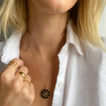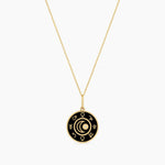 Alchemy is the belief that all areas of life are affected by the powers of the planets. Holding these powers close to us allows a harmonious magic to emerge and brings us to our fullest sense of self. This enigmatic pendant necklace features an embossed design and deep black enamel, creating an unforgettable statement.