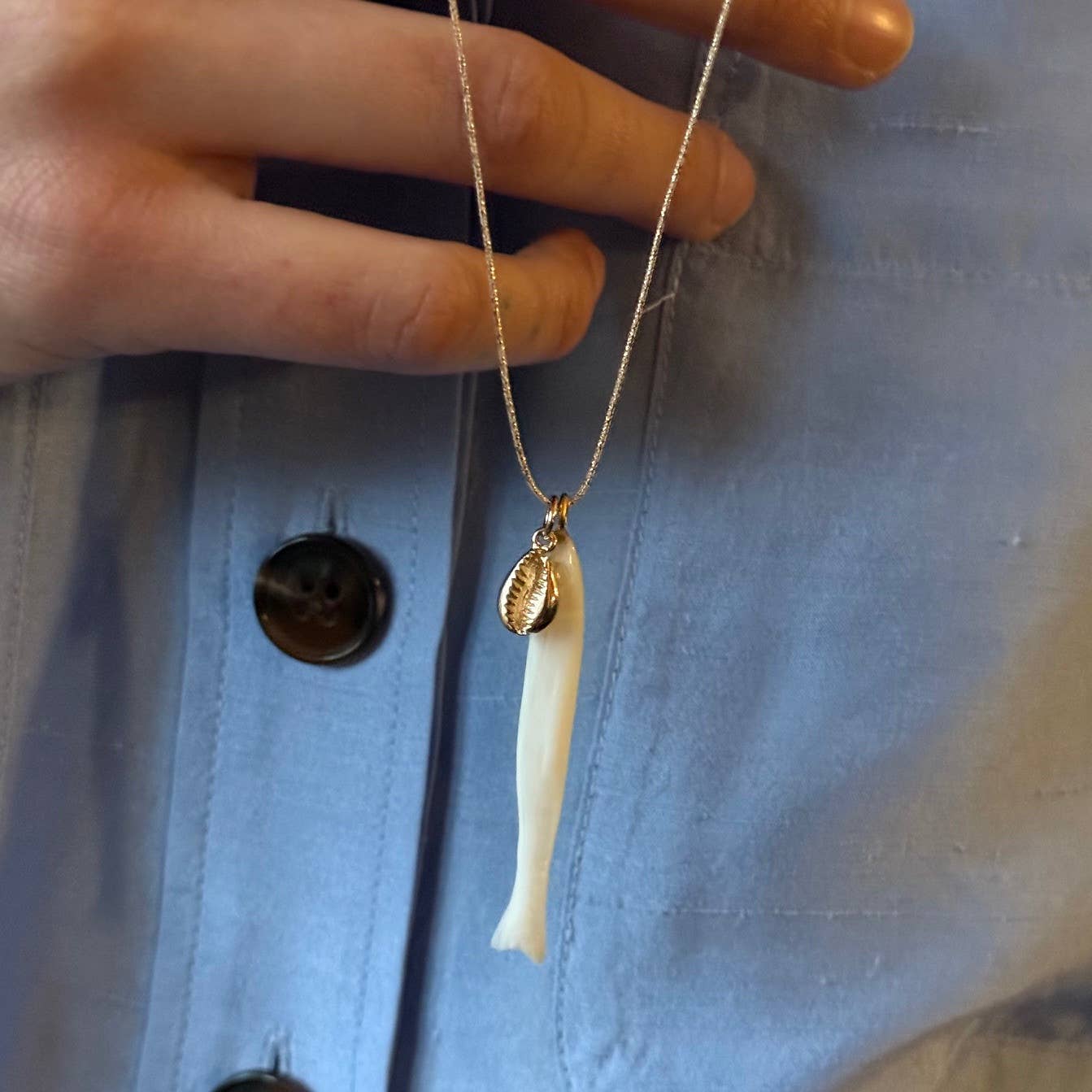 The fish is made of mother-of-pearl, measuring 5 cm, and the gold-plated cowrie is 3 microns and measures 12 mm.