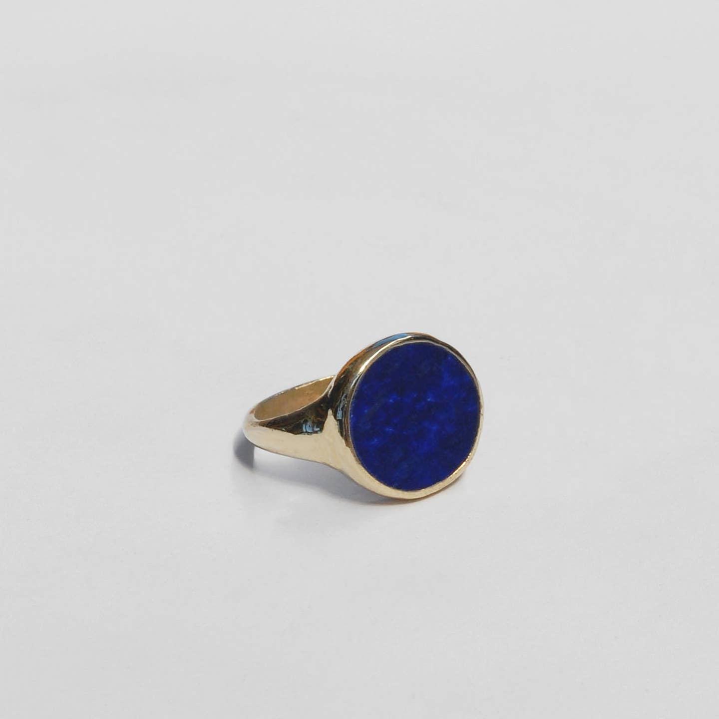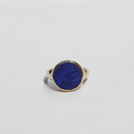 A clean, modern stone signet ring, set with a custom cut disc of lapis lazuli.