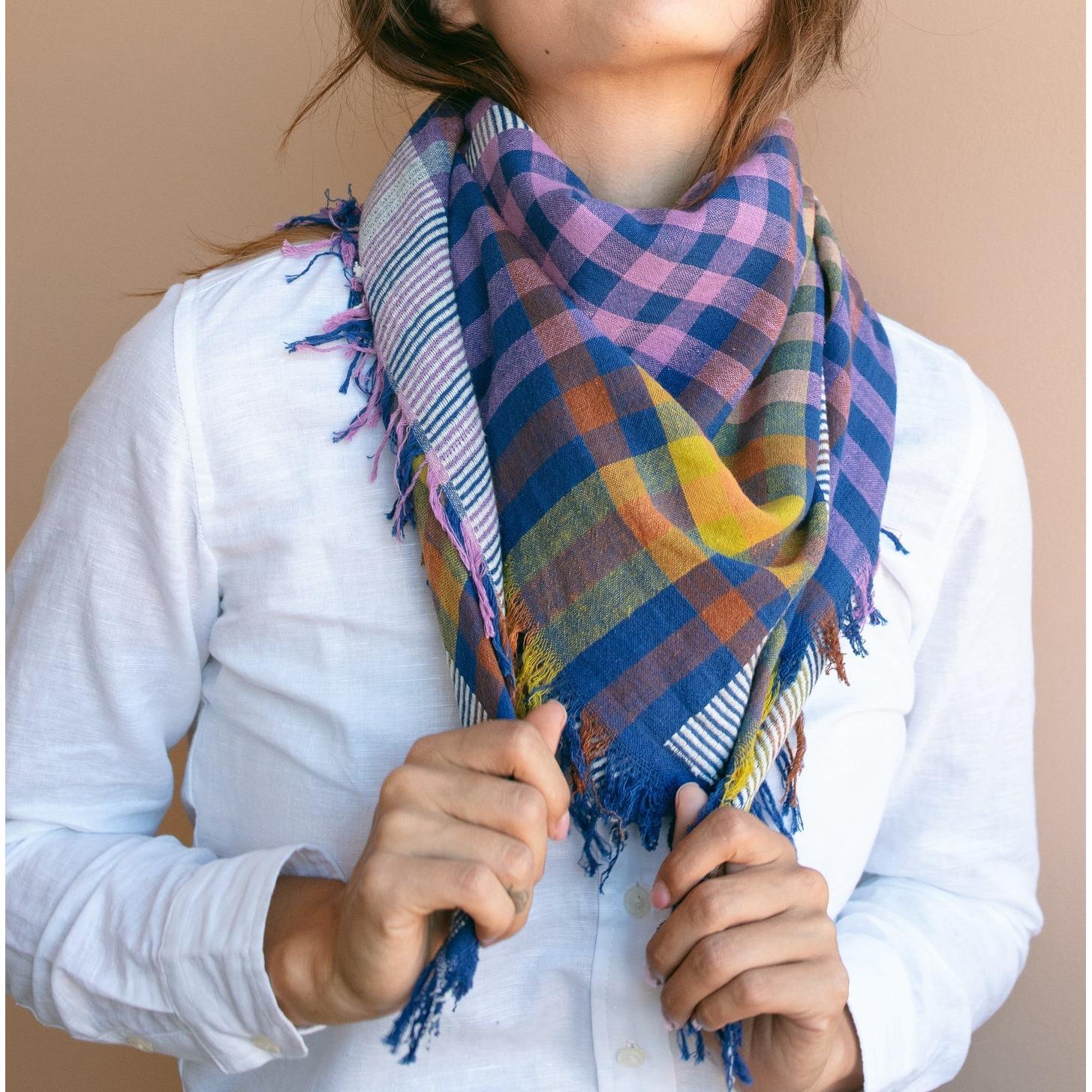 Wrap yourself in this majestic royal blue plaid scarf featuring highlights of chartreuse, pumpkin and orchid. This pretty accessory was inspired by vibrancy of our favorite late summer flowers: cosmos and zinnias. Add this scarf to your wardrobe for a practical and polished outfit top-off that livens up your cold-weather basics.