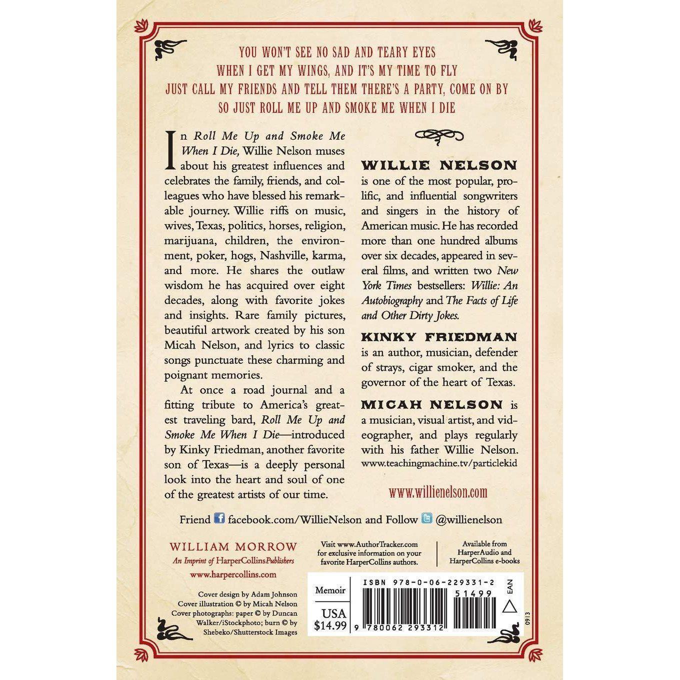 In Roll Me Up and Smoke Me When I Die, Willie Nelson muses about his greatest influences and celebrates the family, friends, and colleagues who have blesses his remarkable journey. Willie riffs on music, wives, Texas, politics, horses, religion, marijuana, children, the environment, poker, hogs, Nashville, karma, and more. He shares the outlaw wisdom he has acquired over eight decades, along with favorite jokes and insights. Rare family pictures, beautiful artwork created by his son Micah Nelson, and lyrics to classic songs punctuate these charming and poignant memories.