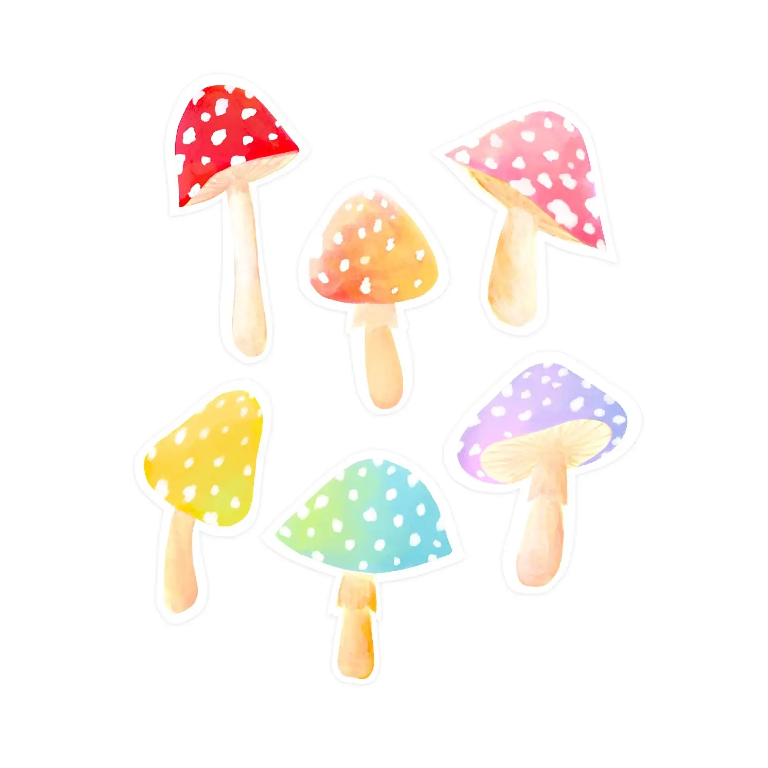 6 rainbow dancing mushrooms make up this trippy sticker pack! Each pack includes: one red, orange, yellow, green/blue, purple and pink mushroom sticker.