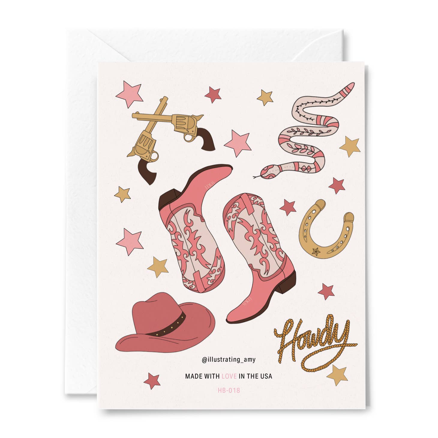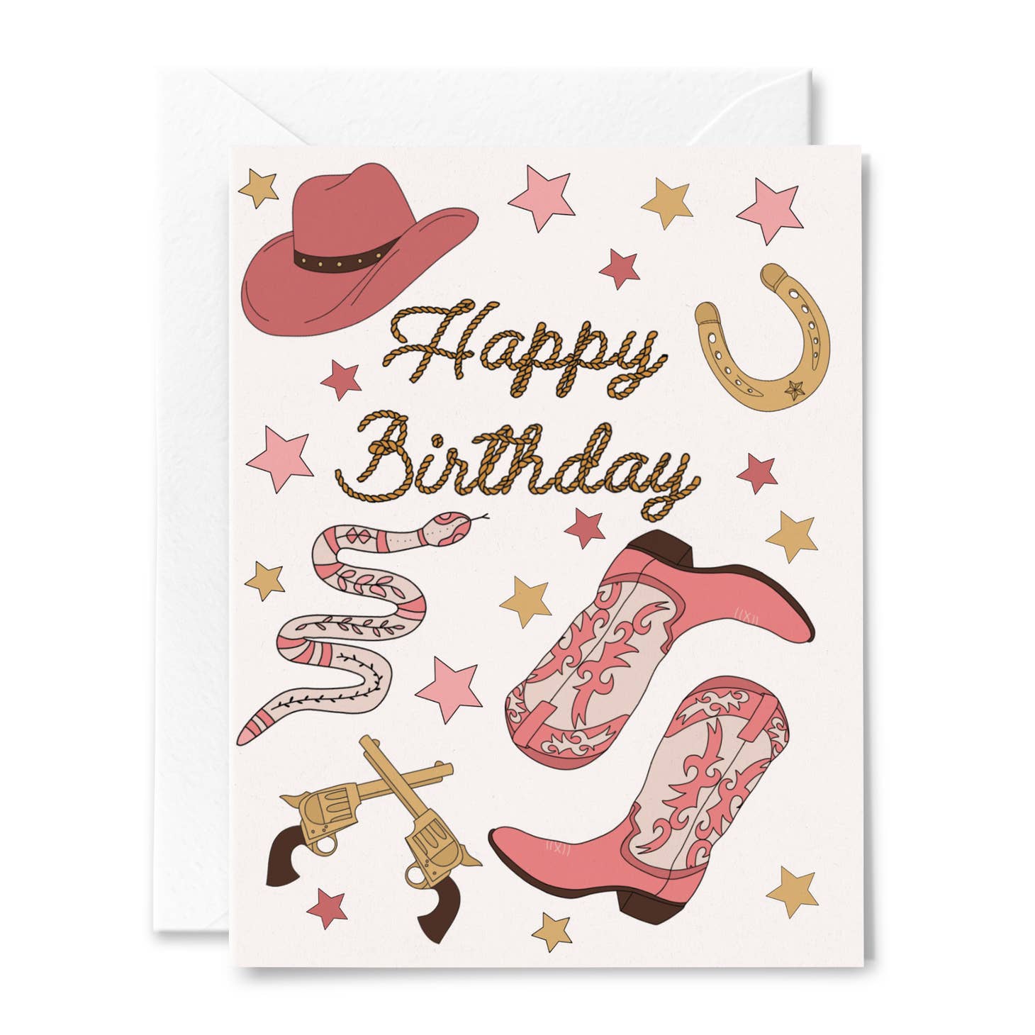 Card features illustrations of pink cowboy boots, Stetson' and gold horse shoes with rope style text that reads 'Happy Birthday'.