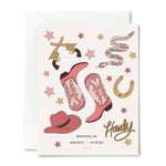 Card features illustrations of pink cowboy boots, Stetson' and gold horse shoes with rope style text that reads 'Happy Birthday'.