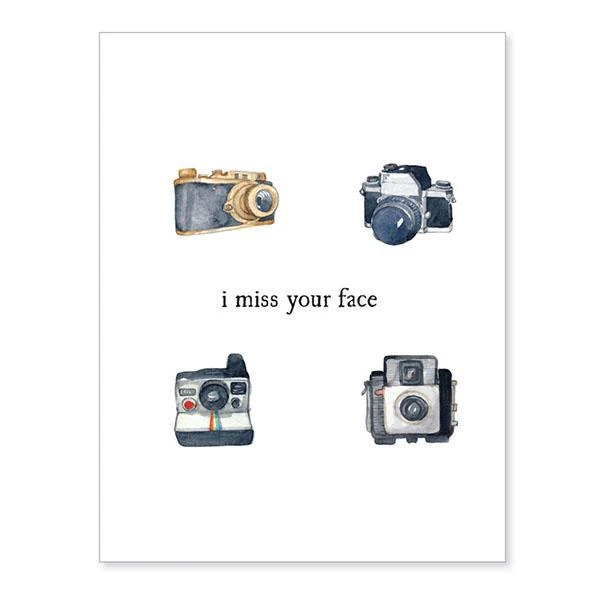 Let that special someone know they're on your mind with this "i miss your face" card, featuring vintage cameras.