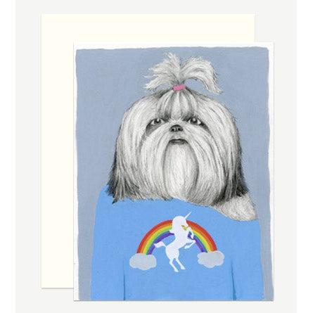 A hand drawn Shih Tzu in a unicorn t-shirt with a rainbow.
