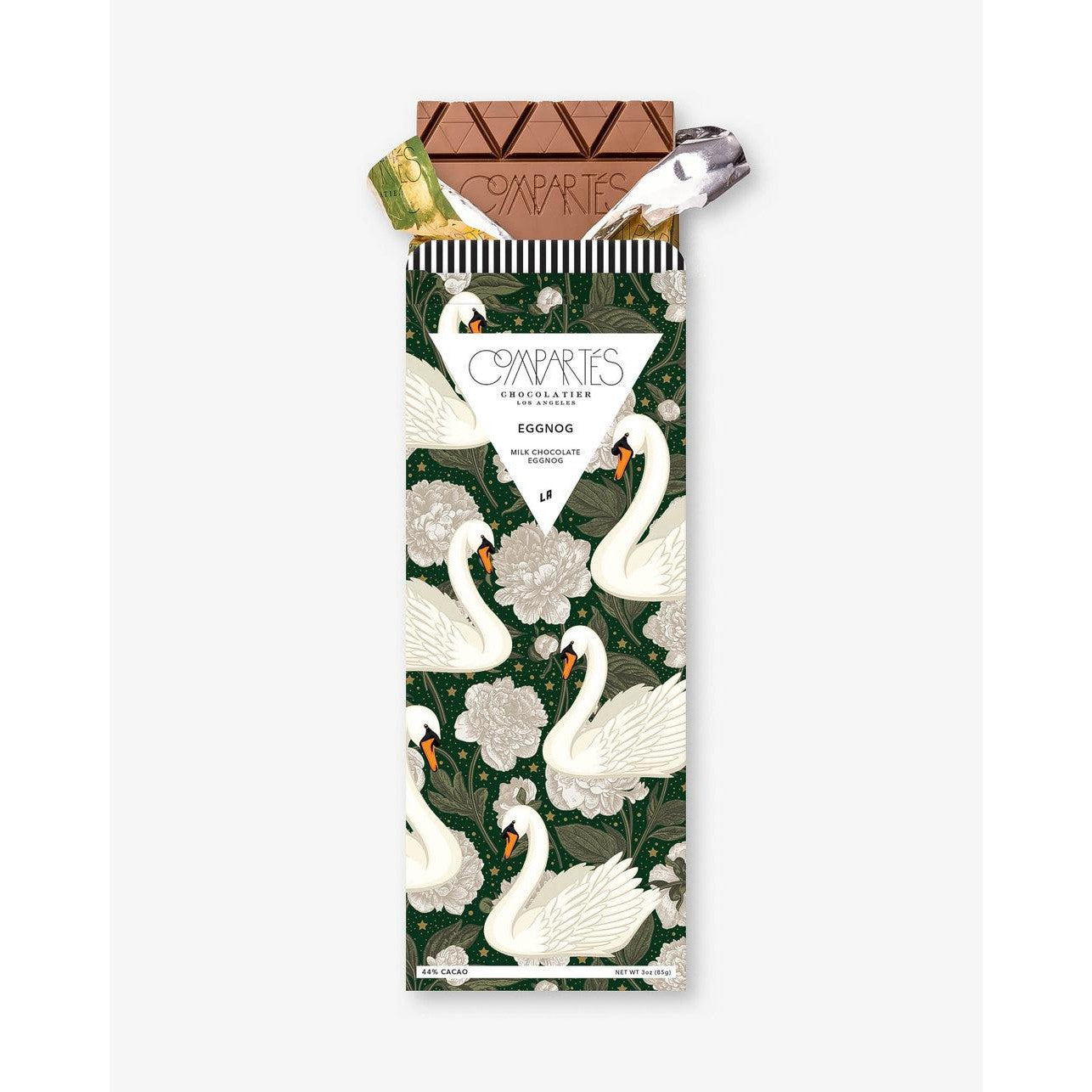 The brand new EGGNOG infused chocolate bar is a winter classic delight elevated to gourmet status in chocolate! Delicious homemade eggnog is laced and infused throughout our silky crowd pleasing milk chocolate. Featuring sophisticated and ultra luxe packaging, this new EGGNOG bar with swan lake motif is a festive holiday gift and treat you will be sure to delight in!
