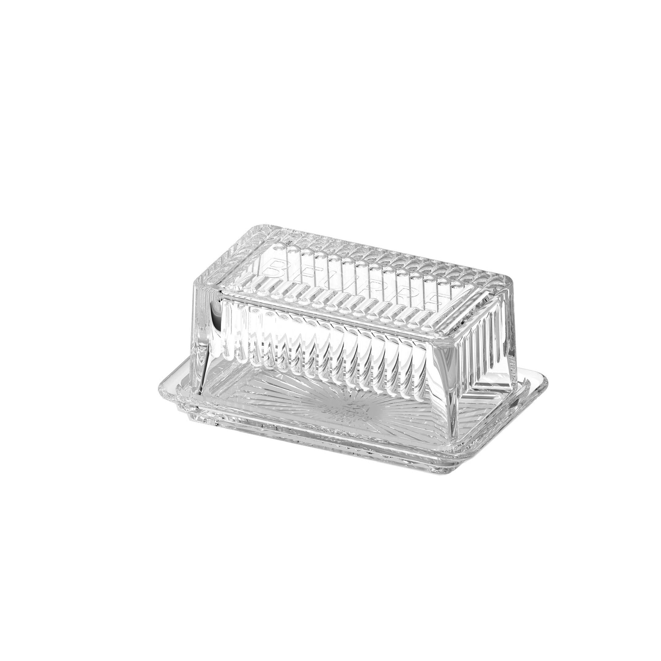 Our European style butter dish, embossed with the French word "Beurre" on the lid, is a beautiful blend of functionality and elegance. Designed to hold a larger European style stick of butter, this glass dish serves not only as a practical storage solution but also as a decorative piece that enhances any dining experience. With a charming vintage appeal, combined with its minimalist design this butter dish embodies the essence of French cuisine and it fits right in with design styles from modern to rustic.