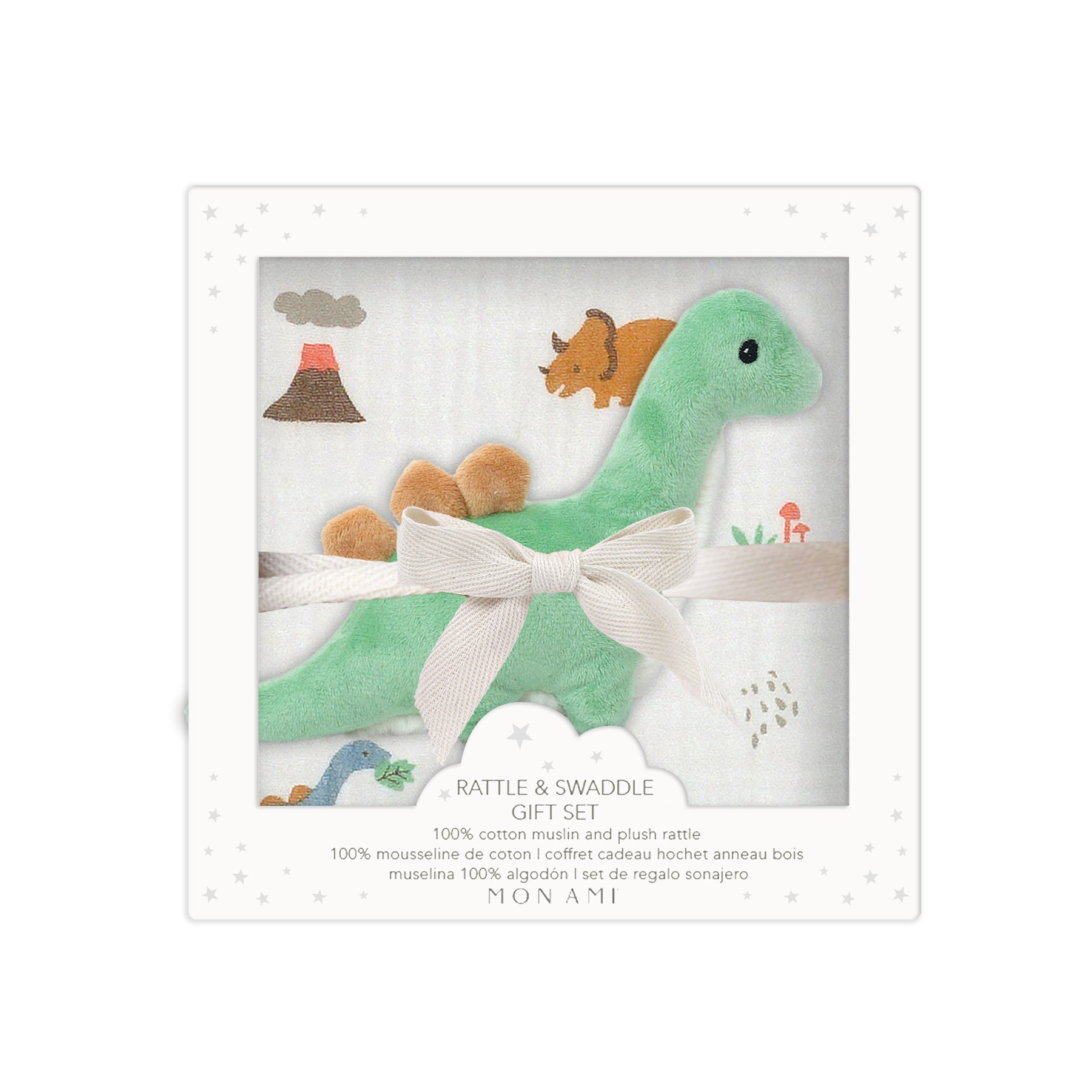 Welcome Baby with Mon Ami Swaddle & Rattle Set! Generously sized premium cotton muslin blanket ideal for swaddling, sunshield, tummy time, privacy throw and more. Comes with coordinating baby rattle for a perfect baby gift.
