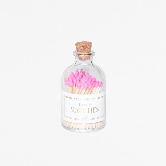 Colored tip matches in an apothecary-inspired glass bottle with a cork top and a striker on the bottom. Approximately 75 matches included.