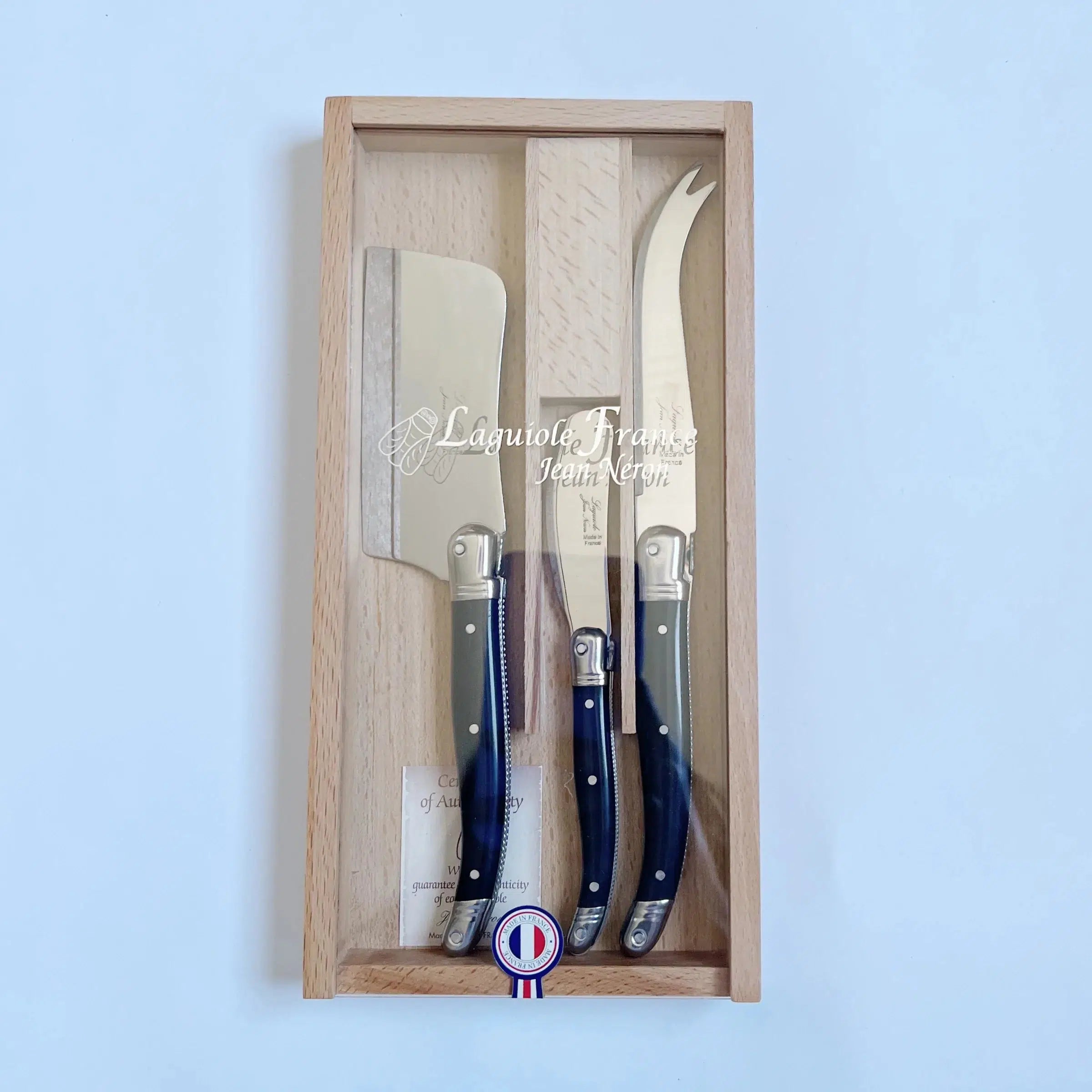 The Laguiole Mini Cheese Set comes in wooden box with a sliding acrylic lid. This set of three utensils includes a hard cheese cutter, fork-tipped knife and soft cheese spreader.