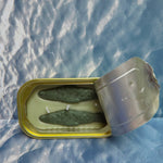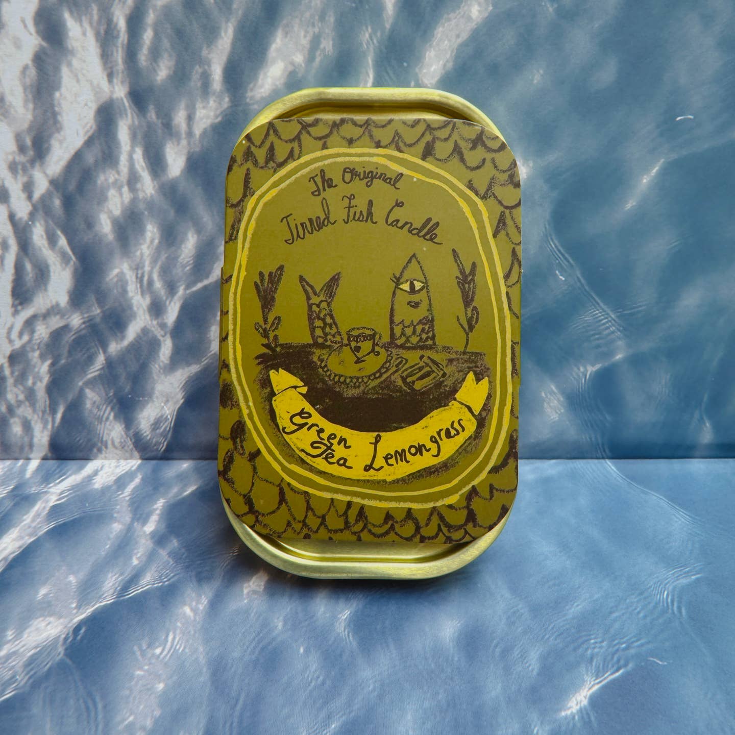 Our bestselling tinned fish candles just got a fresh new look! This one opens with a crisp, citrusy blend of green tea and lemongrass. Inside the tin, green-on-green sardines nestle together—an illustrated story unfolds on the packaging. Still handmade in Atlanta and still peels open like the real thing, now with upgraded easy-open packaging. Soy Wax Blend. Hand poured, sealed, and packaged.