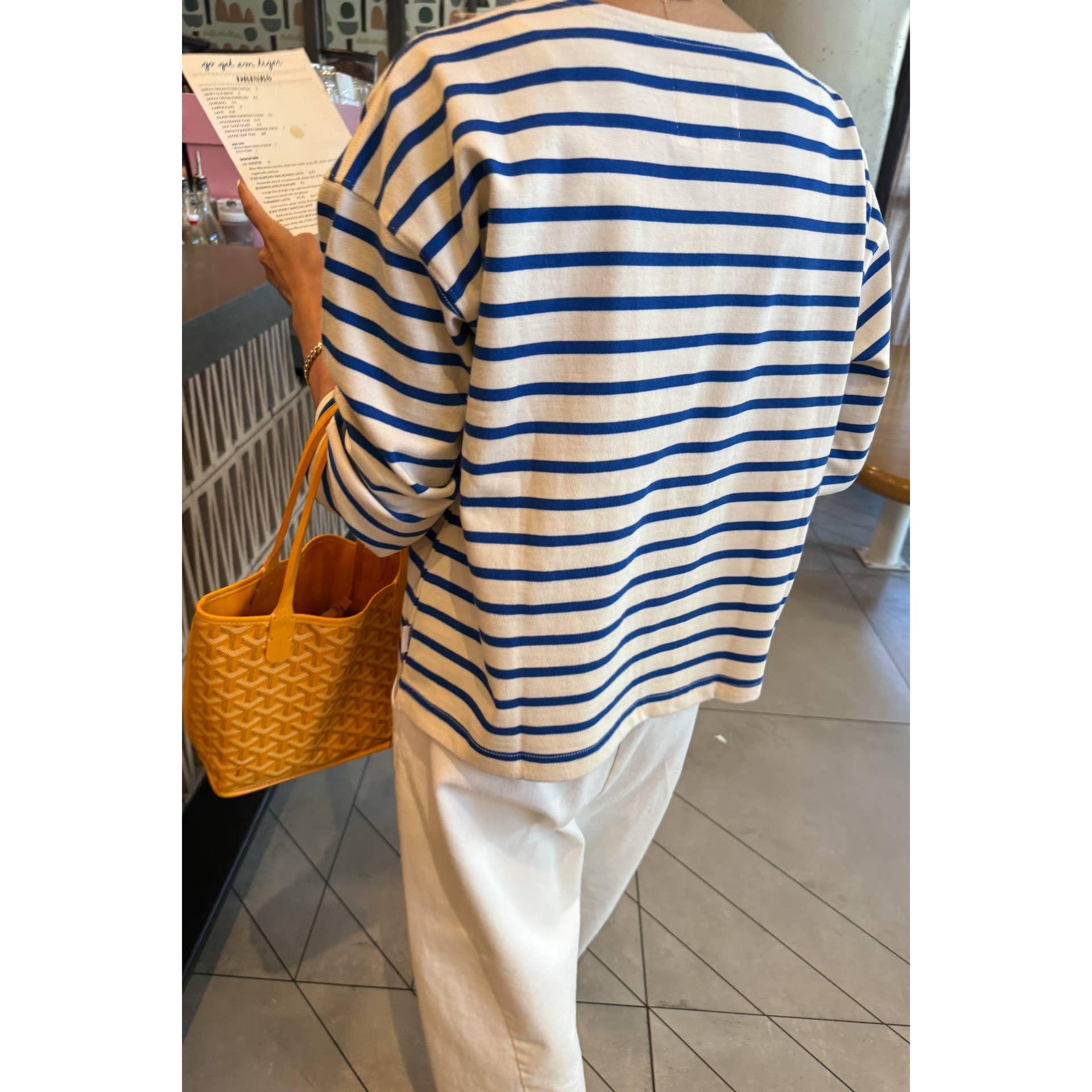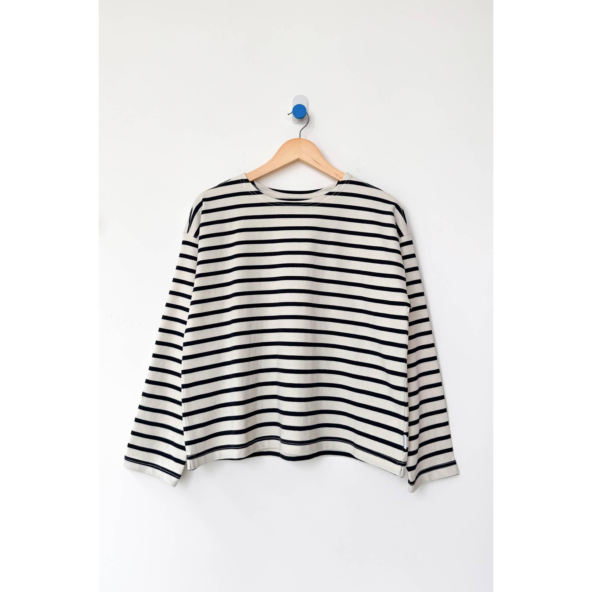 A nautical long sleeve with a classic fit. The Sailor Top takes design cues from the Marseille Top, featuring a Breton stripe and boxy shape, but updated with a flattering round neckline and a slightly cropped length that pairs effortlessly with high-waisted bottoms.