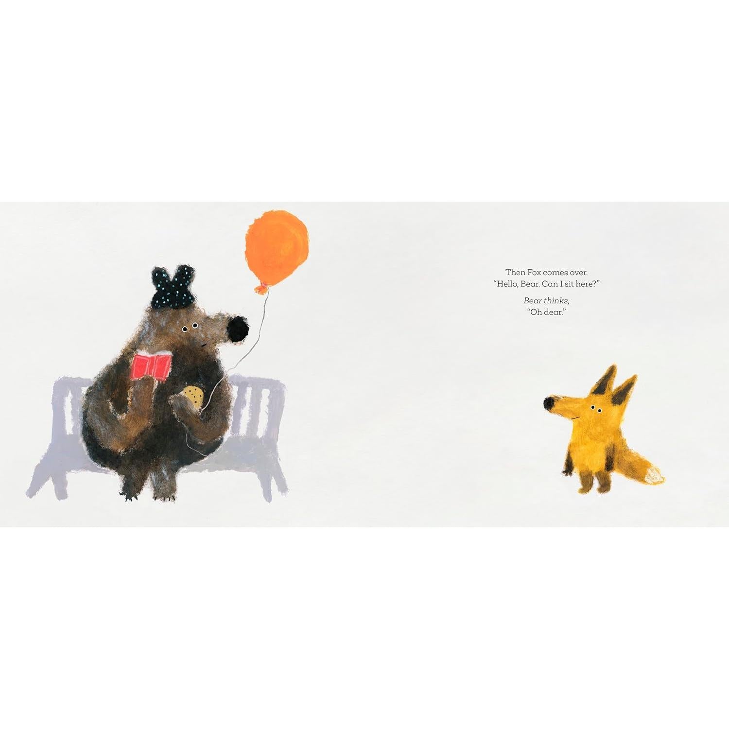 Bear is all set for a perfect day. The sky is blue, there's not a cloud in the sky, and he has all of his most favourite things in the world by his side—a cookie to nibble on, a book to get lost in, a bright balloon to keep him happy, and the perfect bench to take a rest on.