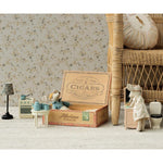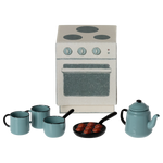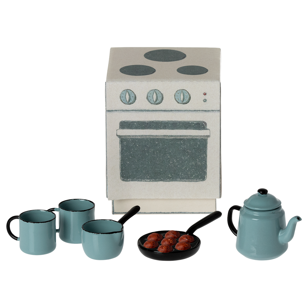 A miniature cooking set with all Madam Blue`s favorites. A can and two cups, a saucepan and a pan with delicious puff cakes which is a traditional scandinavian treat in the winter time. All these parts come in a paper box that looks like a stove.